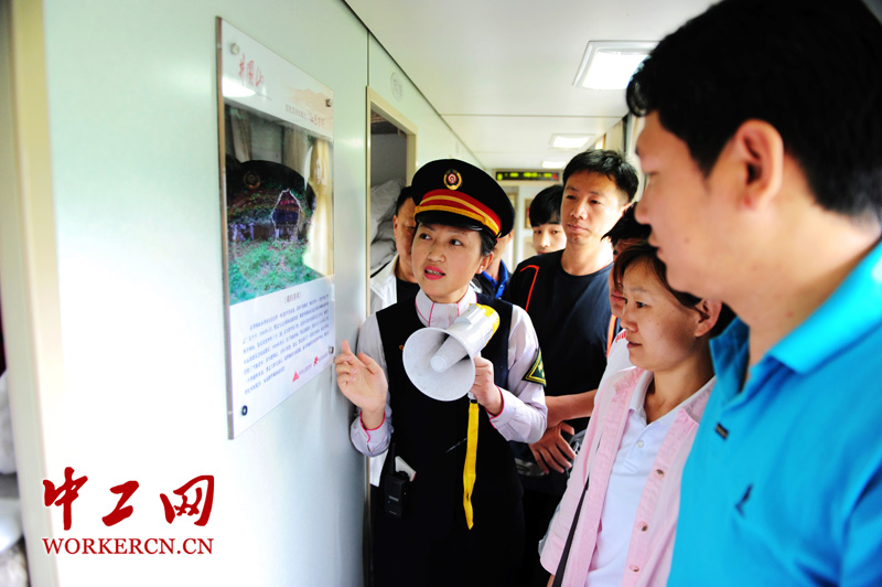 在列车飞驰运行中,身为“井冈山号”列车长,红色“井冈”精神的传承人,徐琴时刻不忘向出行每位旅客宣传阐释井冈山的革命精神。见不少旅客对车厢内别致布置兴趣盎然,徐琴忙不迭当起了义务讲解员,“‘井冈山号’列车是品牌列车”徐琴指了指窗帘上的井冈山五指峰图案,“我们不光在窗帘、卧具上突出井冈山特点,还在每节车厢里悬挂井冈山红色文化的宣传框。在饭菜内容的搭配上,也注意地方特色。其目的就是以列车为流动宣传载体,传承‘井冈’红,‘井冈’红其实也与我们铁路客运服务理念相辅相成、相得益彰。”一席对“井冈”精神的精准阐释,说得围观旅客一个个竖起了大拇指。