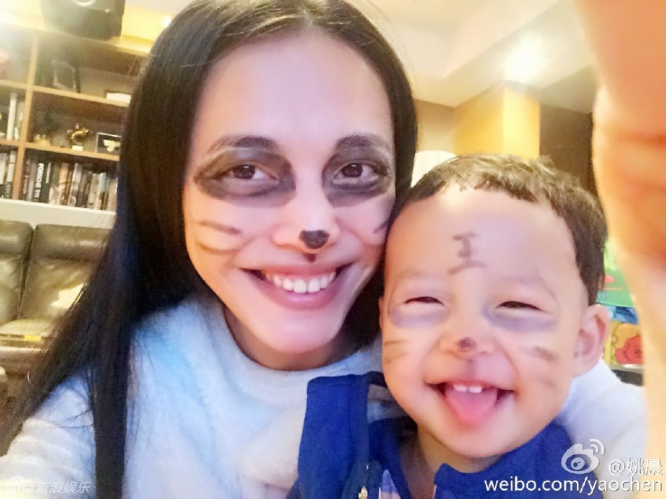 新浪娱乐讯 25日晚,姚晨在微博晒出和老公曹郁、儿子小土豆的合影,三个人化成大花脸,扮猫扮老虎。小土豆遗传爸爸的长相,相似度几乎100%。
