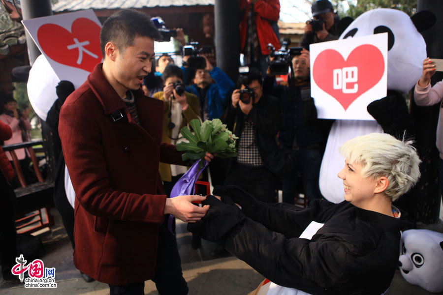 中国网2月14日讯 2月14日,都江堰景区夫妻桥(安澜索桥)上演了一出乌克兰美女化身“国宝”熊猫,向相恋一年的成都男友求婚事迹。