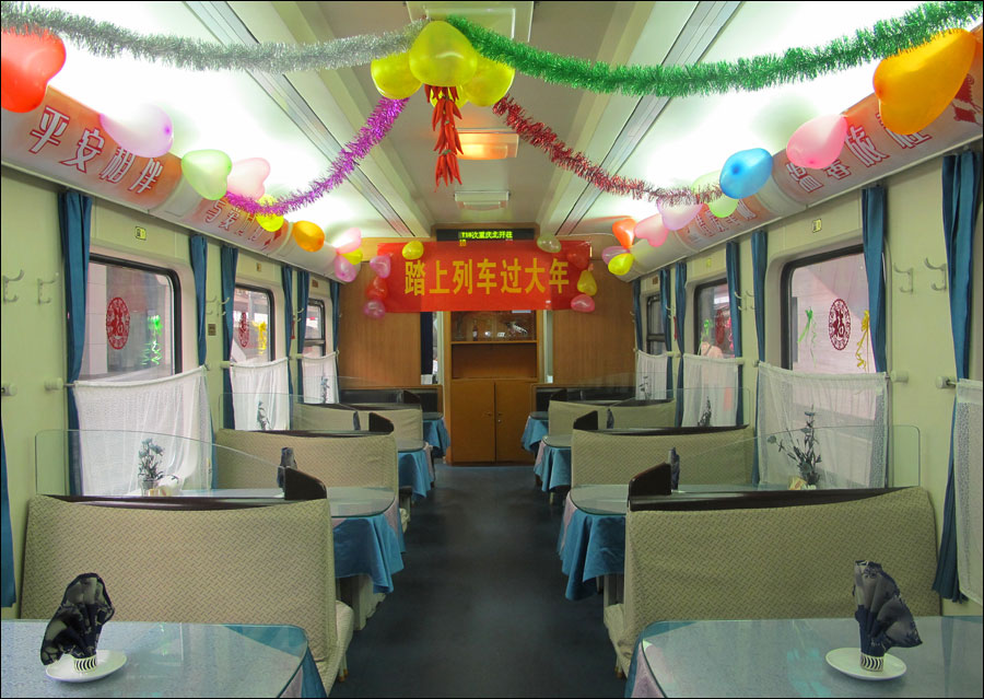 2月18日重庆北至北京西的T10次列车上,工作人员精心布置了餐车,营造节日的气氛。(许凯 摄)