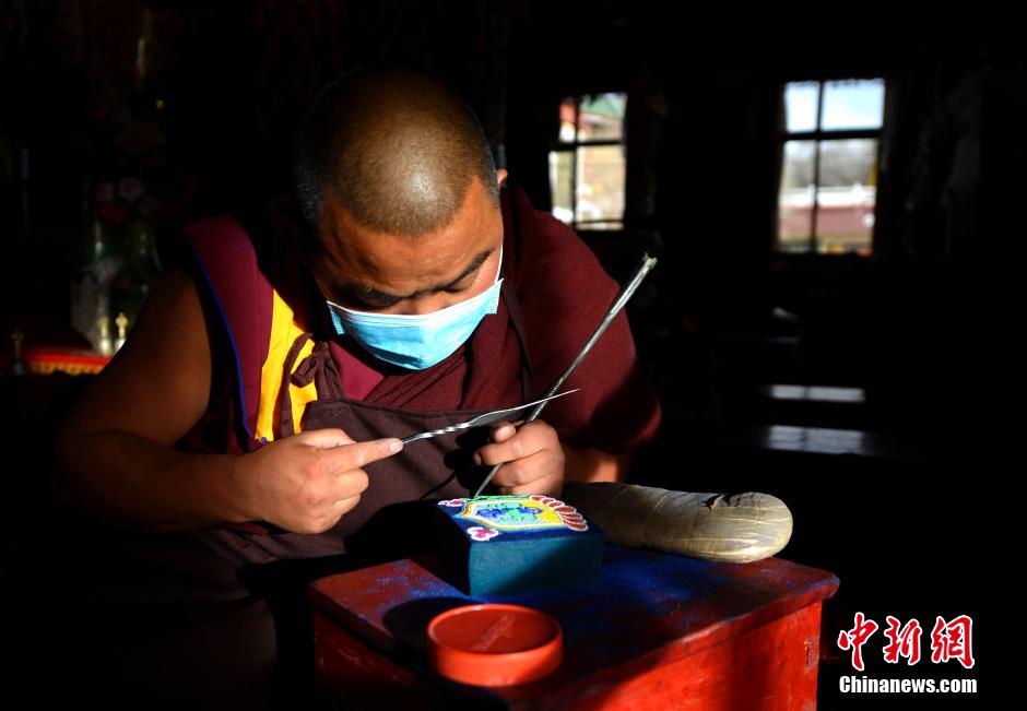 2月25日,公德林寺方丈边巴正在绘制坛城。 中新社发 李林 摄