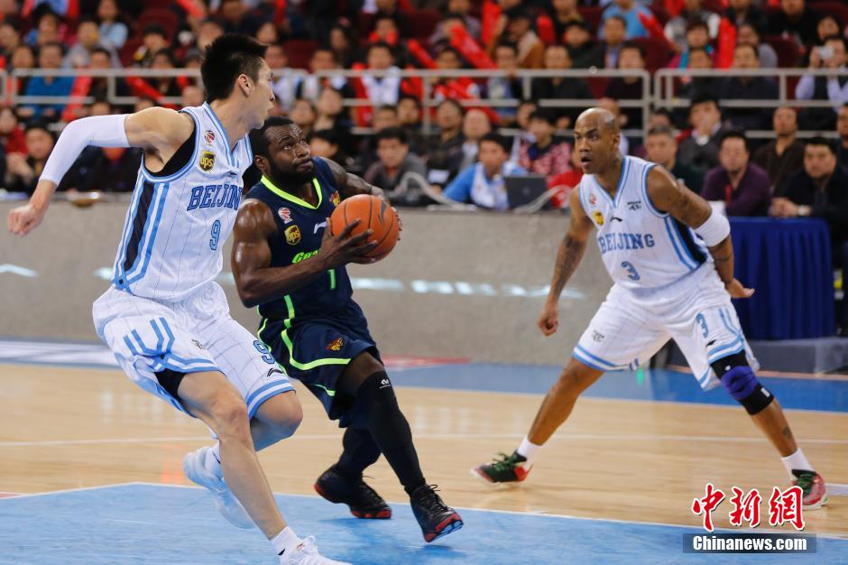 2月25日,广东东莞银行队球员拜纳姆在比赛中突破上篮。中新社发 熊然 摄