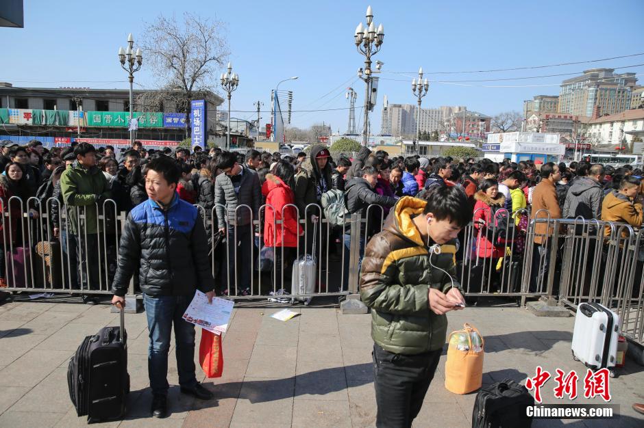 2月26日,旅客在北京火车站外的地铁口排队等待。春节过后,北京站持续迎来大批返程客流。 中新社发 熊然 摄