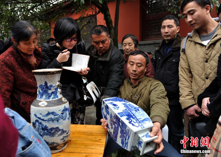 2月26日,成都武侯祠在大庙会期间举办“专家鉴宝”活动。四川省的权威考古及文物鉴定专家为民众带来的“宝贝”现场听诊,并与大家分享收藏知识。图为民众展示自己的“宝贝”。中新社发 安源 摄