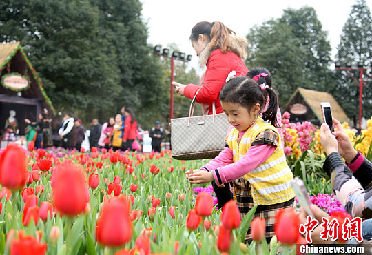 2月26日,成都金沙太阳节现场打造的郁金香花海吸引游客观赏。中新社发 张浪 摄