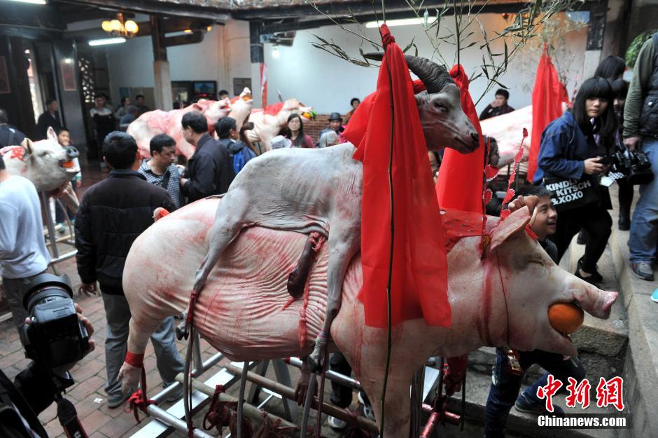 2月26日,福建省漳州市长泰县上演一年一度的山重“赛大猪”民俗活动。最终556斤、535.5斤、528斤的大猪夺得前三甲。漳州市山重村“赛大猪·祈丰年”民俗活动沿袭一千三百多年。每年举办的时间都是正月初八,地点设在山重村薛氏家庙,以此敬天祭祖,祈求新年风调雨顺、五谷丰登。图为大猪进家庙以此敬天祭祖。中新社发 吕明 摄