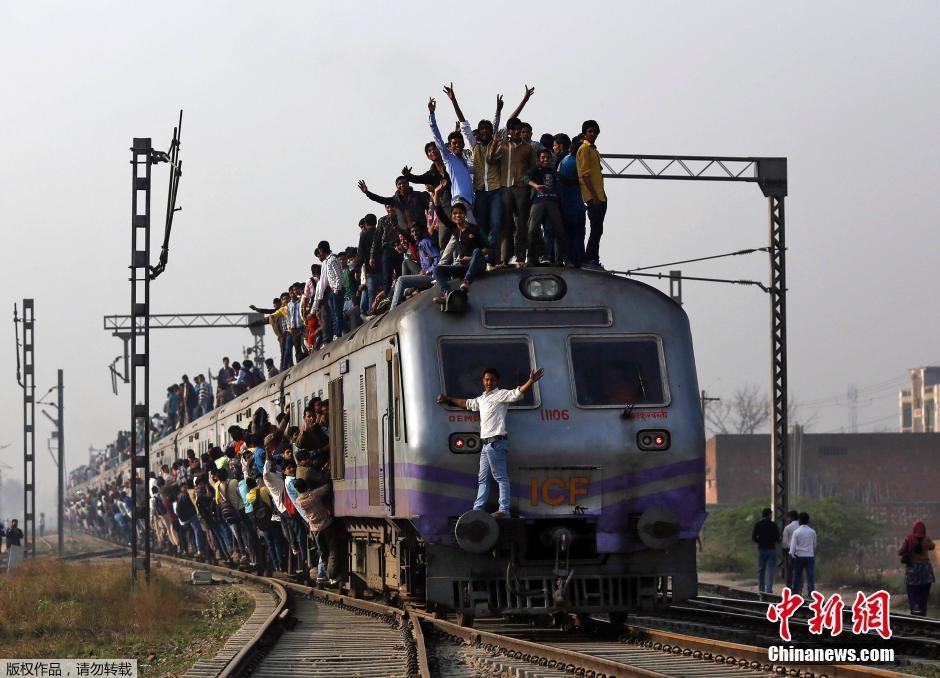 当地时间2月26日,印度新德里郊外拥挤不堪的客运列车。据印度官方当日宣称,将在未来5年内把对铁路建设的投资提高到8.5万亿卢比(约合1370亿美元),对现有铁路进行现代化改造,并引进速度更快的列车。