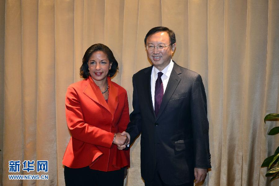2月25日,国务委员杨洁篪在纽约同美国总统国家安全事务助理赖斯举行会晤。 新华社记者王雷摄