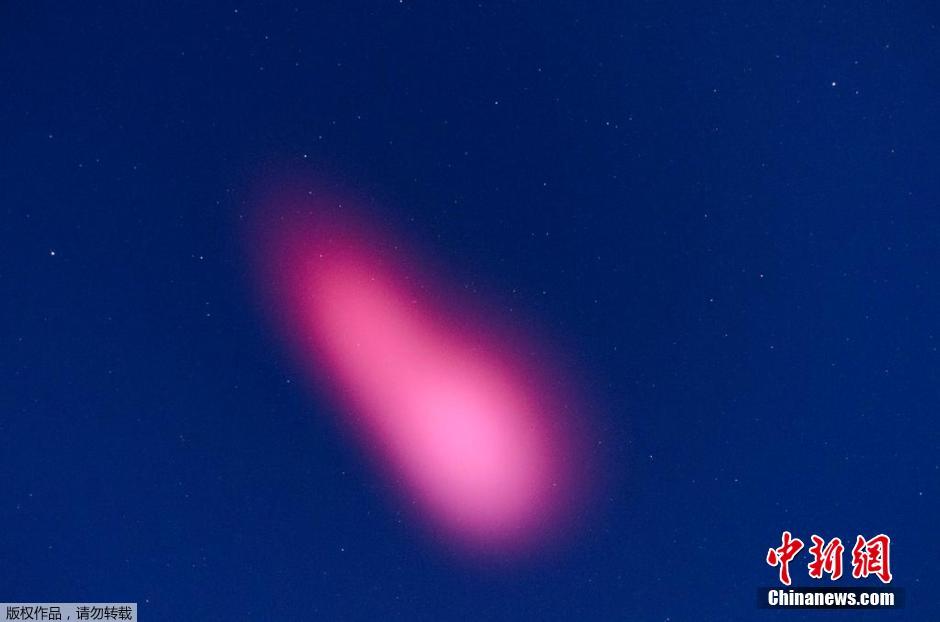当地时间2015年2月25日,美国亚利桑那州,美国国家航空航天局发射火箭后,亚利桑那州上空出现粉红色星体云照亮天空。