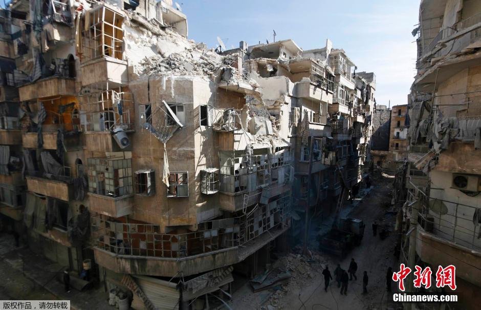 当地时间2月26日,叙利亚阿勒颇出现炸弹袭击。图为当地居民在修复被炸毁的电力设施,据称这次空袭是政府军投下的桶式炸弹造成的。