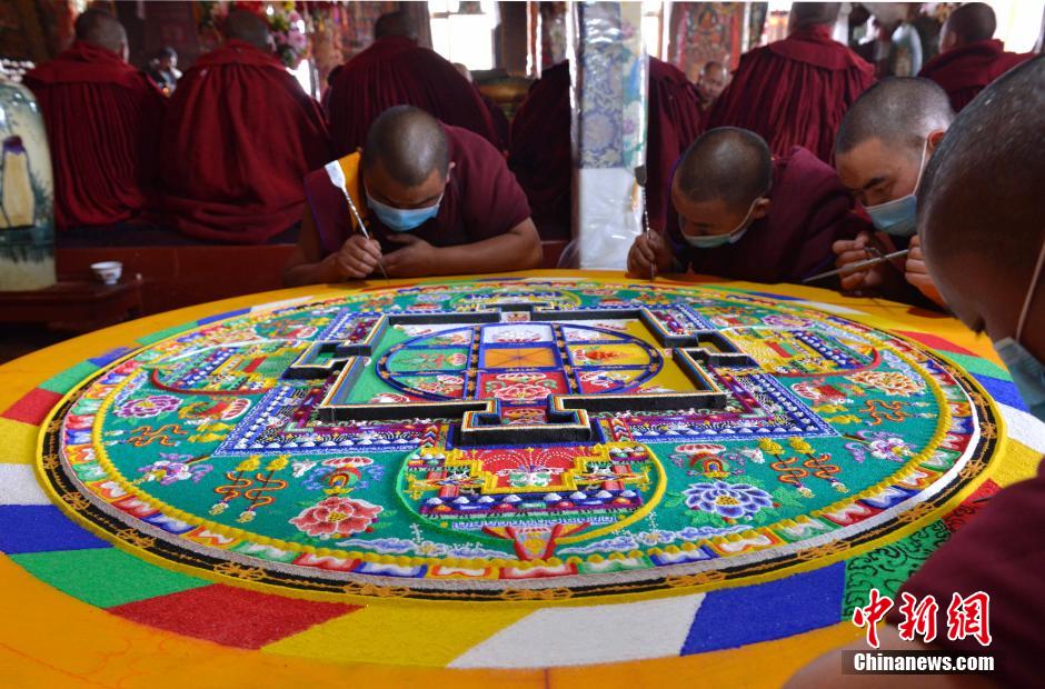 2月25日,公德林寺僧人正在绘制坛城。 中新社发 李林 摄