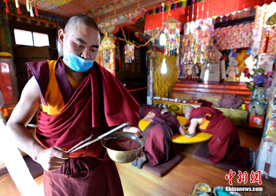 2月22日,僧人正在灌装制作坛城用的彩色细沙。李林 摄