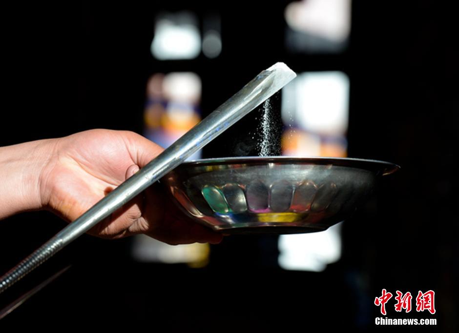 2月22日,僧人正在灌装制作坛城用的彩色细沙。李林 摄