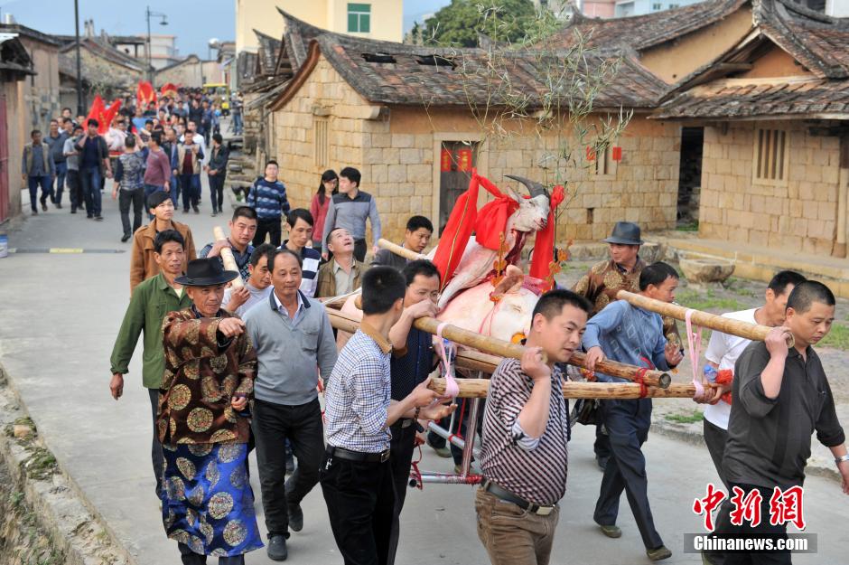 2月26日,福建省漳州市长泰县上演一年一度的山重“赛大猪”民俗活动。最终556斤、535.5斤、528斤的大猪夺得前三甲。漳州市山重村“赛大猪·祈丰年”民俗活动沿袭一千三百多年。每年举办的时间都是正月初八,地点设在山重村薛氏家庙,以此敬天祭祖,祈求新年风调雨顺、五谷丰登。图为村民抗大猪巡街。中新社发 吕明 摄