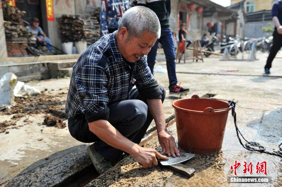 图为村民磨刀。吕明 摄