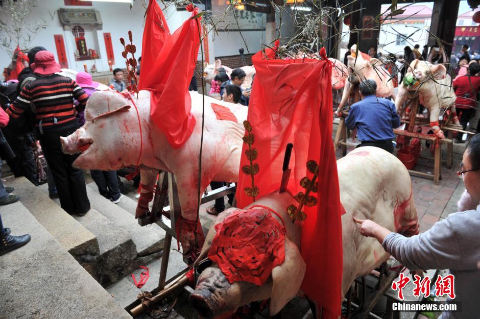 2月26日,福建省漳州市长泰县上演一年一度的山重“赛大猪”民俗活动。最终556斤、535.5斤、528斤的大猪夺得前三甲。漳州市山重村“赛大猪·祈丰年”民俗活动沿袭一千三百多年。每年举办的时间都是正月初八,地点设在山重村薛氏家庙,以此敬天祭祖,祈求新年风调雨顺、五谷丰登。图为大猪进家庙以此敬天祭祖。中新社发 吕明 摄