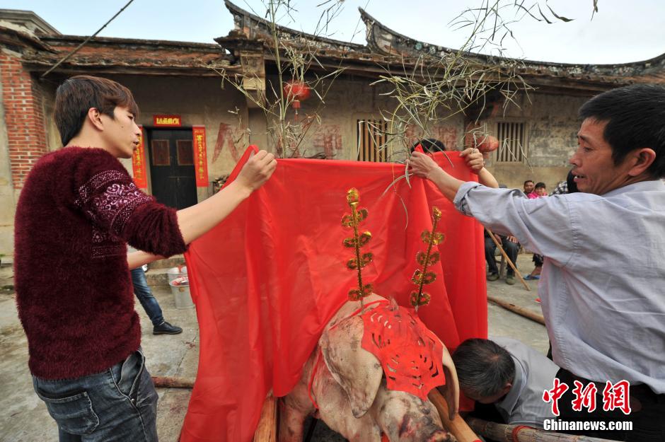 2月26日,福建省漳州市长泰县上演一年一度的山重“赛大猪”民俗活动。最终556斤、535.5斤、528斤的大猪夺得前三甲。漳州市山重村“赛大猪·祈丰年”民俗活动沿袭一千三百多年。每年举办的时间都是正月初八,地点设在山重村薛氏家庙,以此敬天祭祖,祈求新年风调雨顺、五谷丰登。图为为大猪插金花。中新社发 吕明 摄
