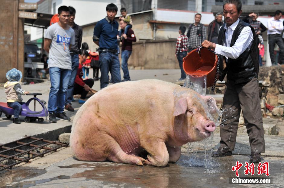 2月26日,福建省漳州市长泰县上演一年一度的山重“赛大猪”民俗活动。最终556斤、535.5斤、528斤的大猪夺得前三甲。漳州市山重村“赛大猪·祈丰年”民俗活动沿袭一千三百多年。各参祭的大猪嘴含红桔,头插金花,腿系红绳。当晚,家庙灯火通明,鼓乐齐鸣,男女老少欢聚一堂,观看大猪,给参祭的大猪秤重,最重的前三名获奖,得奖的大猪披红缎,供奉者得奖励。目前,山重“赛大猪、祭祖先、庆丰收”活动已被列为市级非物质文化遗产。图为为大猪浇水净身。 吕明 摄