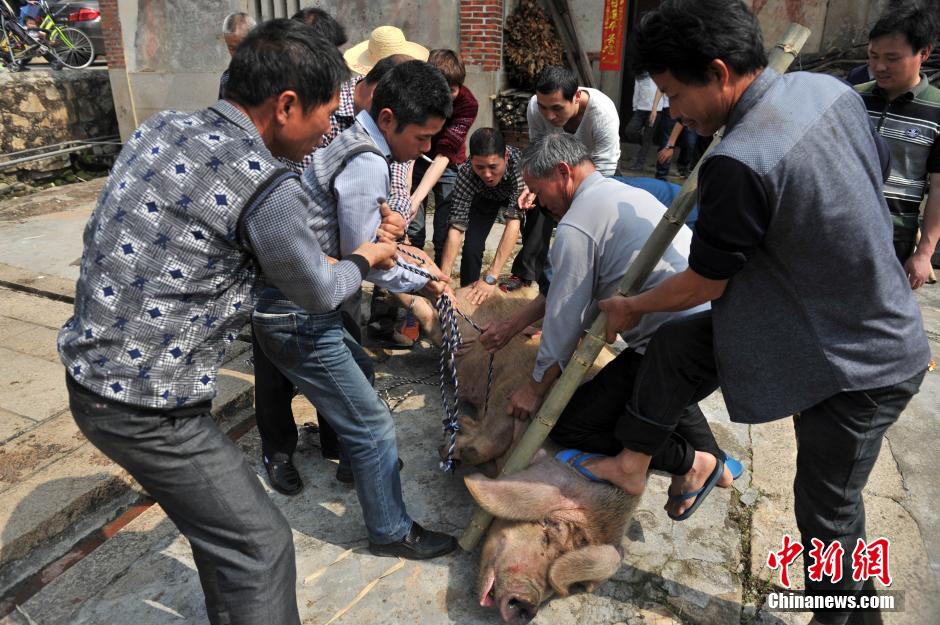 图为多人捆绑大猪准备宰杀。吕明 摄