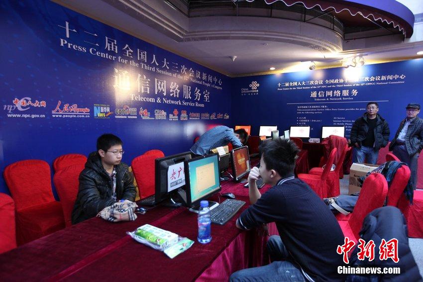 2015年2月26日,设在北京梅地亚中心的全国两会新闻中心即将启用,记者提前探访。图片来源:CFP视觉中国