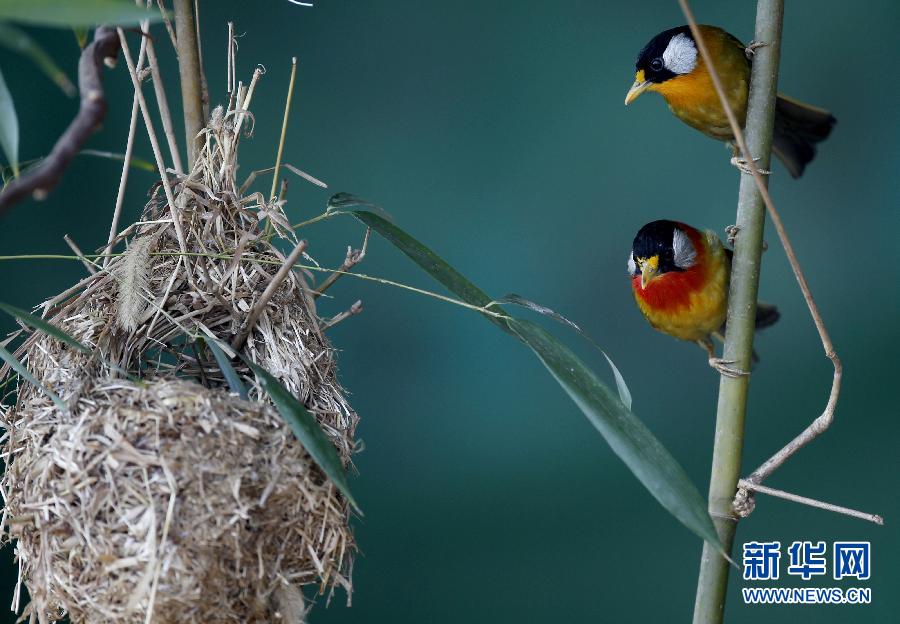 2月26日,两只银耳相思鸟在“看家”。日前,位于沈阳市平罗镇的沈阳百鸟生态园正式营业,园内共有10多种、近百只鸟。与室外的严寒相比,这里温度适宜、鸟语花香,成为人们近距离赏鸟的好去处。新华社发