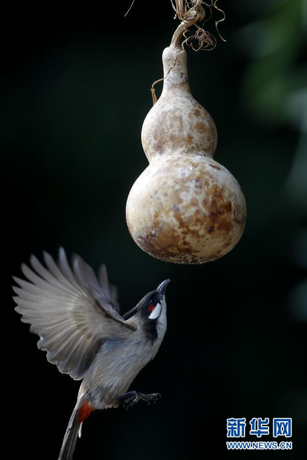 2月26日,一只髙髻冠鸟在葫芦下觅食。日前,位于沈阳市平罗镇的沈阳百鸟生态园正式营业,园内共有10多种、近百只鸟。与室外的严寒相比,这里温度适宜、鸟语花香,成为人们近距离赏鸟的好去处。新华社发