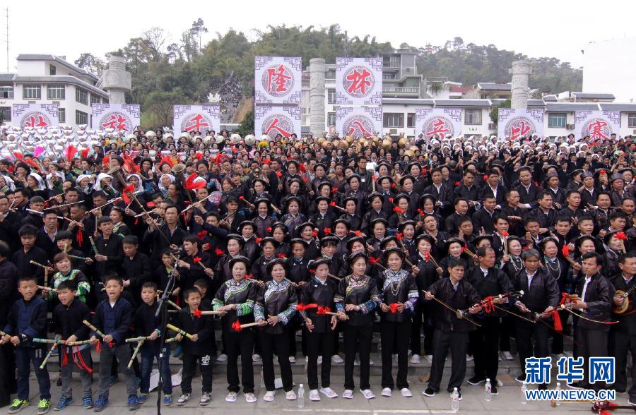 2月26日,壮族群众在广西隆林各族自治县县城参加“八音坐唱”比赛活动。当日是农历正月初八,广西壮族自治区百色市隆林各族自治县举办“八音坐唱”比赛活动,来自广西、贵州20个村屯的1500余名壮族居民参加比赛,欢庆新春。 “八音坐唱”是当地世代相传的民间说唱艺术,乐队使用八种乐器,演奏的旋律古朴、流畅、悠美、悦耳,常用于民族节日、婚庆嫁娶、建房、祝寿等场合,深受当地群众喜爱。新华社发(林斌 摄)