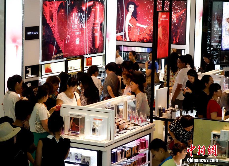 2月26日,三亚春节度假游火热,位于三亚市郊的全球最大单体免税店海棠湾国际购物中心内依然人头攒动,为保障服务质量,不少品牌商店采取限流措施,游客在商店门口排起了长队。因海南实施离岛免税政策,到免税店购物正成为越来越多来琼游客的选择。据海南省商务厅消息,2015年春节期间海南离岛免税销售额近3亿元。中新社发 杜洋 摄