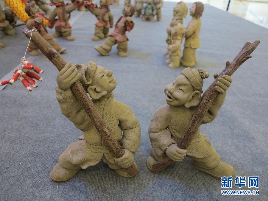 这是展出的放鞭炮造型的泥人(2月26日摄)。 2月26日,山东省潍坊市世纪泰华广场展出众多造型各异的泥人,放鞭炮、舞狮子、敲锣打鼓……各式各样的喜庆造型为新春增添了不少节日气氛。新华社记者 邵琨 摄