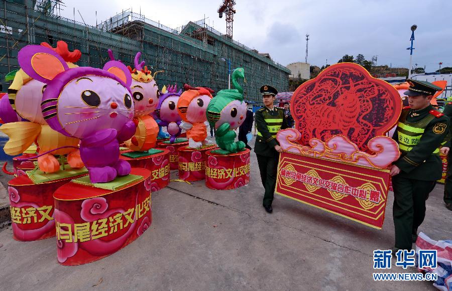 2月26日,连江县边防官兵和当地乡亲在黄岐台轮码头装运花灯。当日,由福建省福州市马尾乡亲赠送的40组羊年花灯在海关、边防等部门的帮助下,从连江县黄岐台轮码头装船运往马祖,为马祖乡亲送去新春祝福,共同迎接元宵佳节。新华社记者 张国俊 摄
