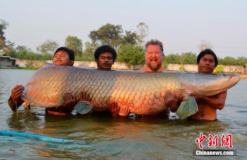 2015年2月27日消息(具体拍摄时间不详),泰国叻丕府,4名男子费时2小时将一只重达460斤的巨滑舌鱼,从而创下世界纪录。