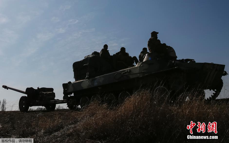 当地是间2015年2月27日,乌克兰Blagodatne,明斯克协议生效后,乌克兰政府军的装甲运兵车、军用车辆和火炮从杰巴利采沃撤出。