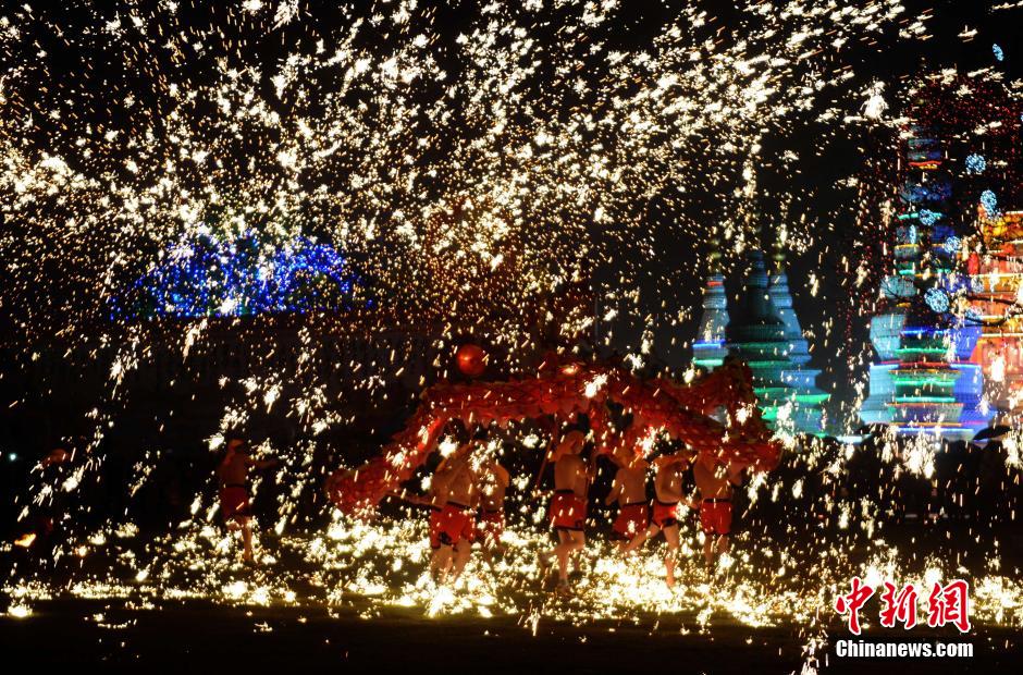 2月27日晚,拥有“天下第一火龙”之称的重庆铜梁火龙在长沙橘子洲受市民热捧,熔化的铁水漫天飞舞。据悉,重庆铜梁火龙已有600多年历史,且铜梁龙舞被列入第一批国家级非物质文化遗产名录。中新社发 杨华峰 摄
