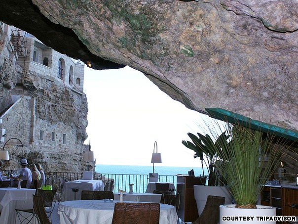 洞穴餐厅(Ristorante Grotta Palazzese)将其餐桌置于悬崖边上,这样,顾客就可以俯瞰大海。不止这样,这个山洞是深深嵌入一块石灰岩悬崖内的用餐洞穴,在这里可以俯瞰亚得里亚海。 在水面上方74英尺(约22.5米)的地方,用餐者可以享受美味的贝类馄炖,还可以在习习海风中享受加入龙虾的意大利汤饭,身下海水拍岸的声音不绝于耳。从5月到10月,当洞穴灯光倒映在水面,使得这里的夜景尤其惊艳迷人。