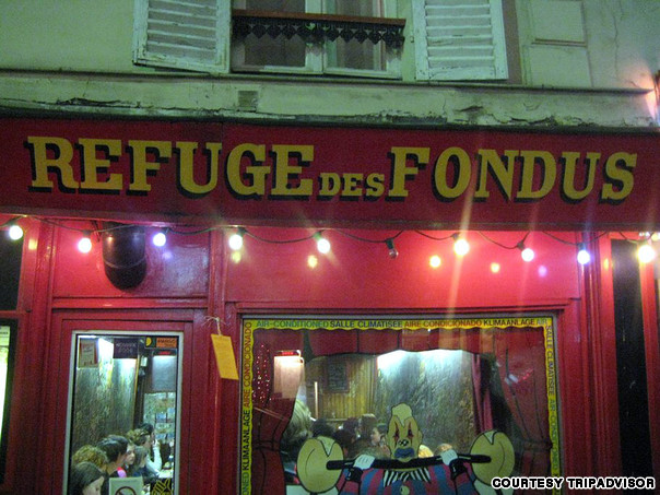 从外面看起来,它可能有点像奢侈的嘉年华,但是它的菜单很简单。大部分火锅餐厅都一样,只有两种选择:红酒或白酒,起司或肉类。但是这个餐厅就有点古怪了。在巴黎,以酒杯盛装的葡萄酒是要收税的。为了绕开这一规定,避难所火锅(Le Refuge des Fondues)将红酒都用防溢婴儿奶瓶装。几个朋友一起吮吸塑料奶嘴的乐趣往往会加速红酒消费。如果酒后你想涂鸦一番,你的周围还有一大面满是涂鸦的墙。