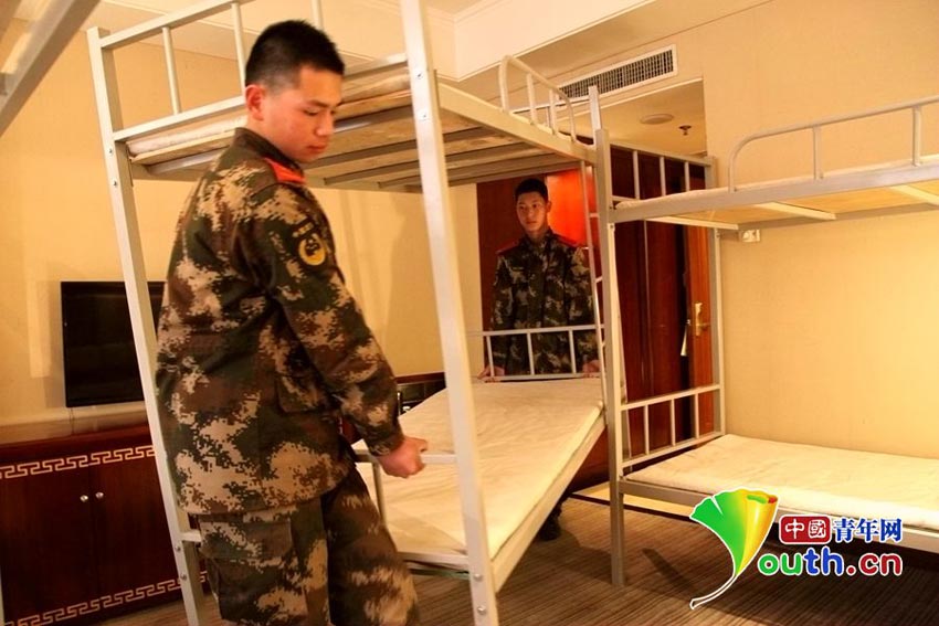 据悉,今年全国两会期间,将有一百多名武警战士驻扎在两会代表团住地首都大酒店和梅地亚中心。在首都大酒店内,记者发现,为了在节俭办会的基础上保障战士们的休息,部分标准间被已改为8人间。(隗功臣 姜润邈)