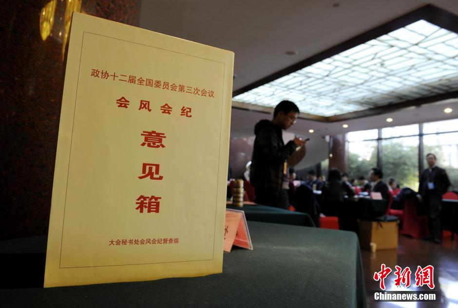 3月1日,会风会纪意见箱亮相全国政协十二届三次会议委员驻地。中新社发 张斌 摄