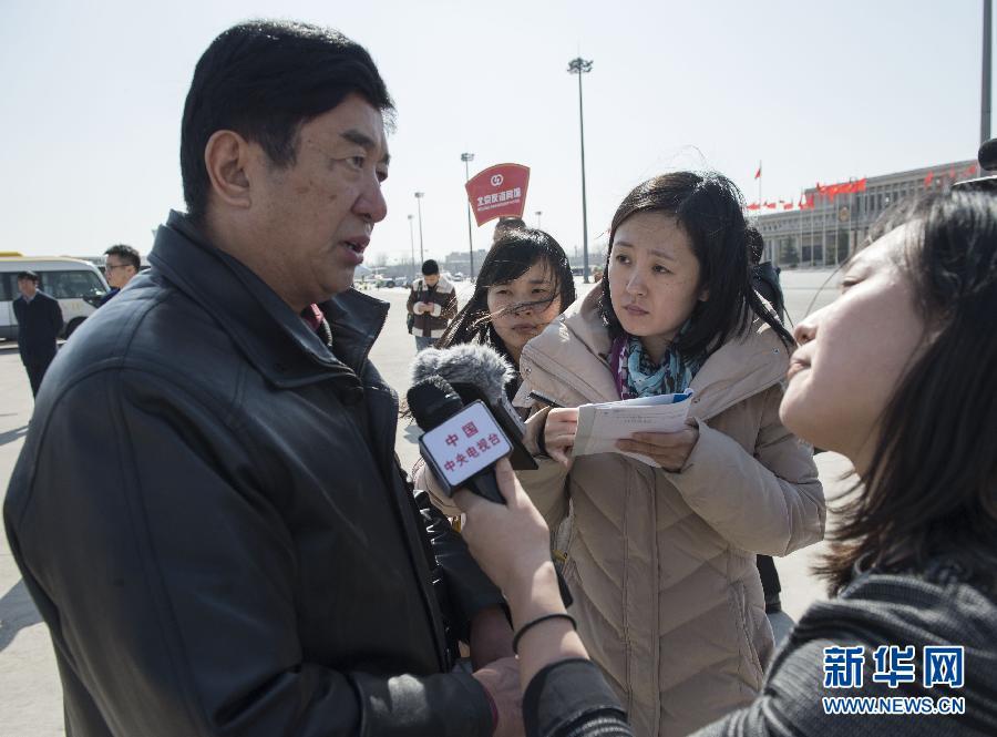 3月1日,来自西藏自治区的全国政协委员抵达北京,出席全国政协十二届三次会议。这是全国政协委员计明南加(左)在北京首都国际机场接受记者采访。新华社记者王晔摄 图片来源:新华网