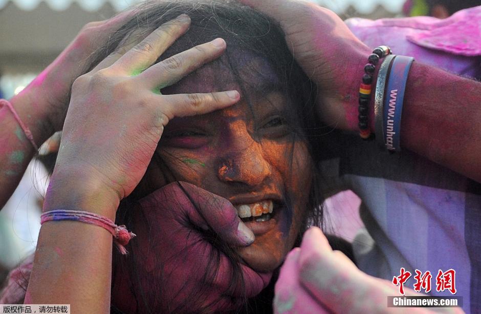 当地时间2015年3月1日,菲律宾马尼拉,民众投掷彩色粉末,庆祝胡里节。该节日意在庆祝冬季结束,春季到来。