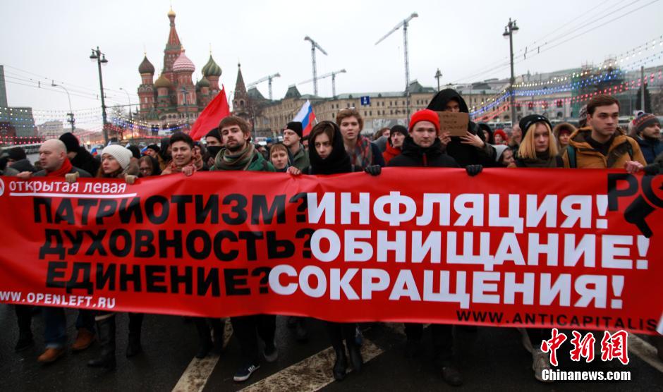 当地时间3月1日,莫斯科民众手持旗帜、标语为此前遇害的俄反对派领导人、前副总理涅姆佐夫举行哀悼游行。 中新社发 王修君 摄
