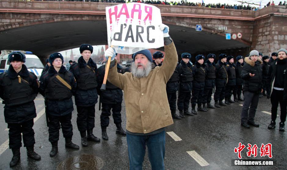 图为游行民众在警方前高举标语。 中新社发 王修君 摄