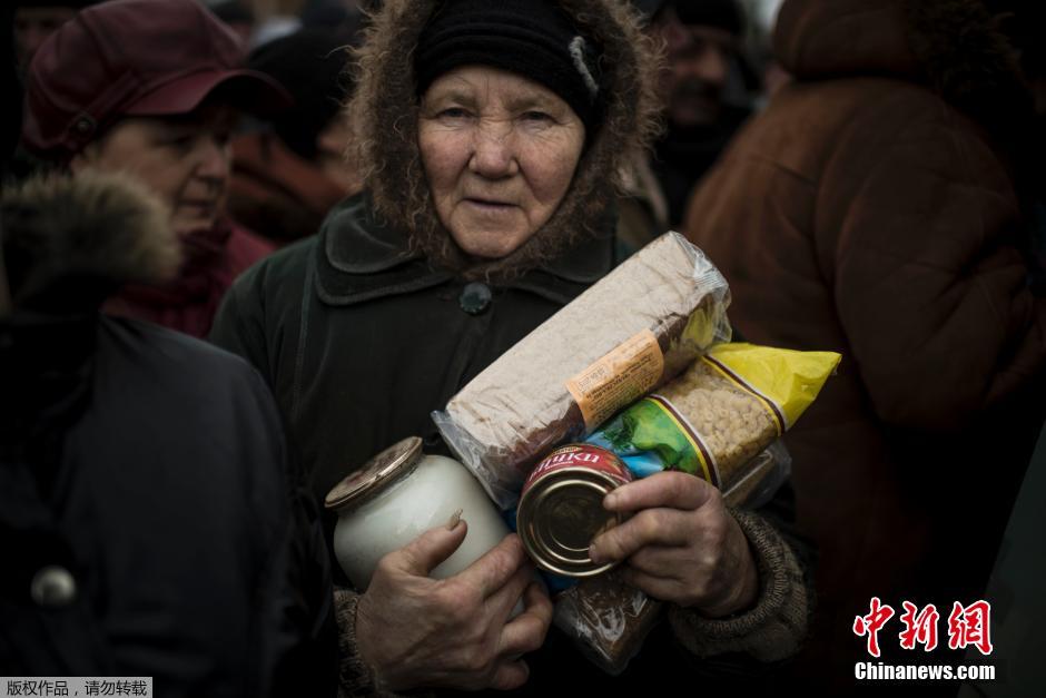 当地时间2015年2月28日,乌克兰波帕斯纳,当地民众这个在领取人道主义救援物资。乌克兰政府军与民间武装近期将各自的重型武器从前线后撤,为当地民众带来了可持续停火的希望。