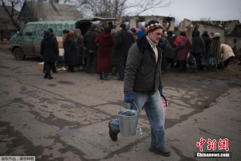 当地时间2015年2月28日,乌克兰波帕斯纳,当地民众这个在领取人道主义救援物资。乌克兰政府军与民间武装近期将各自的重型武器从前线后撤,为当地民众带来了可持续停火的希望。