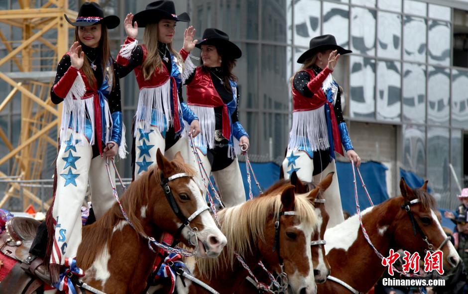 当地时间2月28日,女子马术仪仗队在休斯敦牛仔节游行队伍中靓丽登场。当天,百余支各色主题乐队、花车和牛仔方阵,在市民的欢呼声中沿街道行进,标志着一年一度的“休斯敦牲畜展与牛仔节”由此拉开帷幕。这一堪称全世界规模最大的牛仔竞技活动创办于1932年,集农牧业展览、竞技、娱乐和美国西部文化展示于一体,每年吸引观众超过200万人次。中新社发 王欢 摄