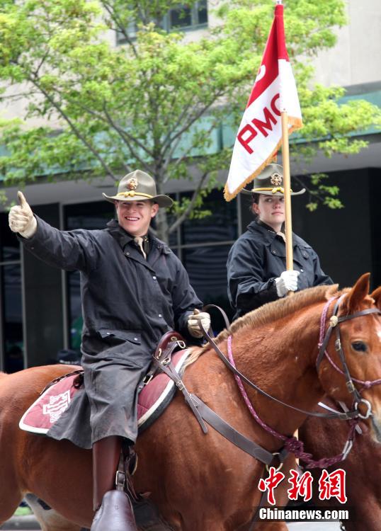 当地时间2月28日,得州农工大学的骑兵队走在牛仔节游行队伍前列。中新社发 王欢 摄