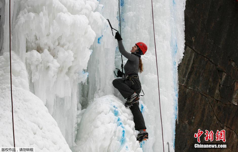 当地时间2015年2月28日,俄罗斯克拉斯诺亚尔斯克,民众在Rock Pillars自然保护区参加“冰瀑”攀登比赛。
