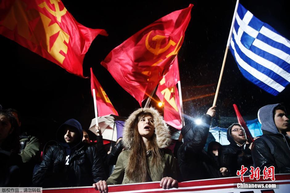 当地时间2015年2月27日,希腊雅典,希腊民众在塔玛广场组织游行,抗议希腊政府与IMF和欧央行关于希腊国家债务的协定。