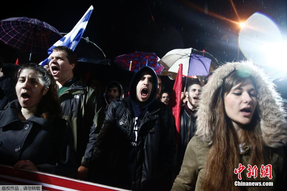 当地时间2015年2月27日,希腊雅典,希腊民众在塔玛广场组织游行,抗议希腊政府与IMF和欧央行关于希腊国家债务的协定。