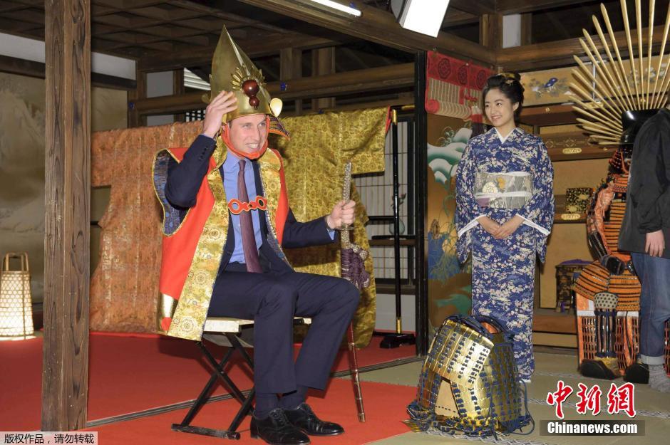 当地时间2015年2月28日,日本东京,英国威廉王子参观NHK电视台,期间试穿日本传统武士服装。