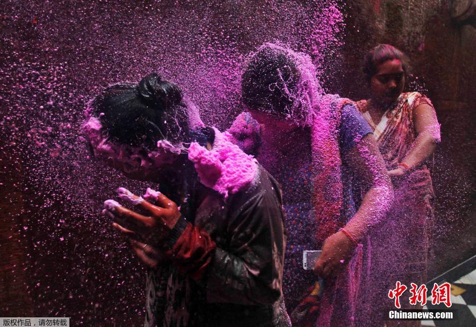 当地时间2015年3月1日,印度维伦达文,印度教信徒在班奇比哈里寺庙庆祝彩色胡里节。